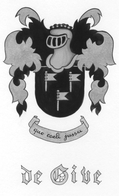 Nous Constantin Bouhelier, ecuier Seigneur de Beaulieu, heraut Ray d’armes provincial de sa Majeste sous le titre de Limbourg, de Luxembourg, de Flandres et de Namur exercant l’etat de premier Roy d’armes de ses pays-bas; Etant requi de donner temoignage du port des armes de la Famille de Give, originaire du Condoz au pais de Liege, et depuis habitee dans la province de Namur. Mous n’avons pu refuser une si juste demande. Ainsi atestons et certifions que cette Famille est honorable et ancienne, portant pour armoiries un ecusson de Sable a trois banieres dites geroettes d’argent, deux en chef et une en pointe, de la maniere qu’elles sont cy dessus depeintes et blasonnees qui peuveut etre ainsi portees par le sieur Noel de Give, docteur en medecine, pour n’apporter aucun prejudice aux Edits et ordonnaces de saditte Majeste ni famille d’autruy. En foi de verite nous avons sine Cette et y fait apposer le scel de notre dit etat ou office. Donne et avise es chambres heraldiques tenues a present en sa ville de Namur le vingt-huitieme juillet dix-sept cent dix. Signe par C Bouhelier, Limbourg